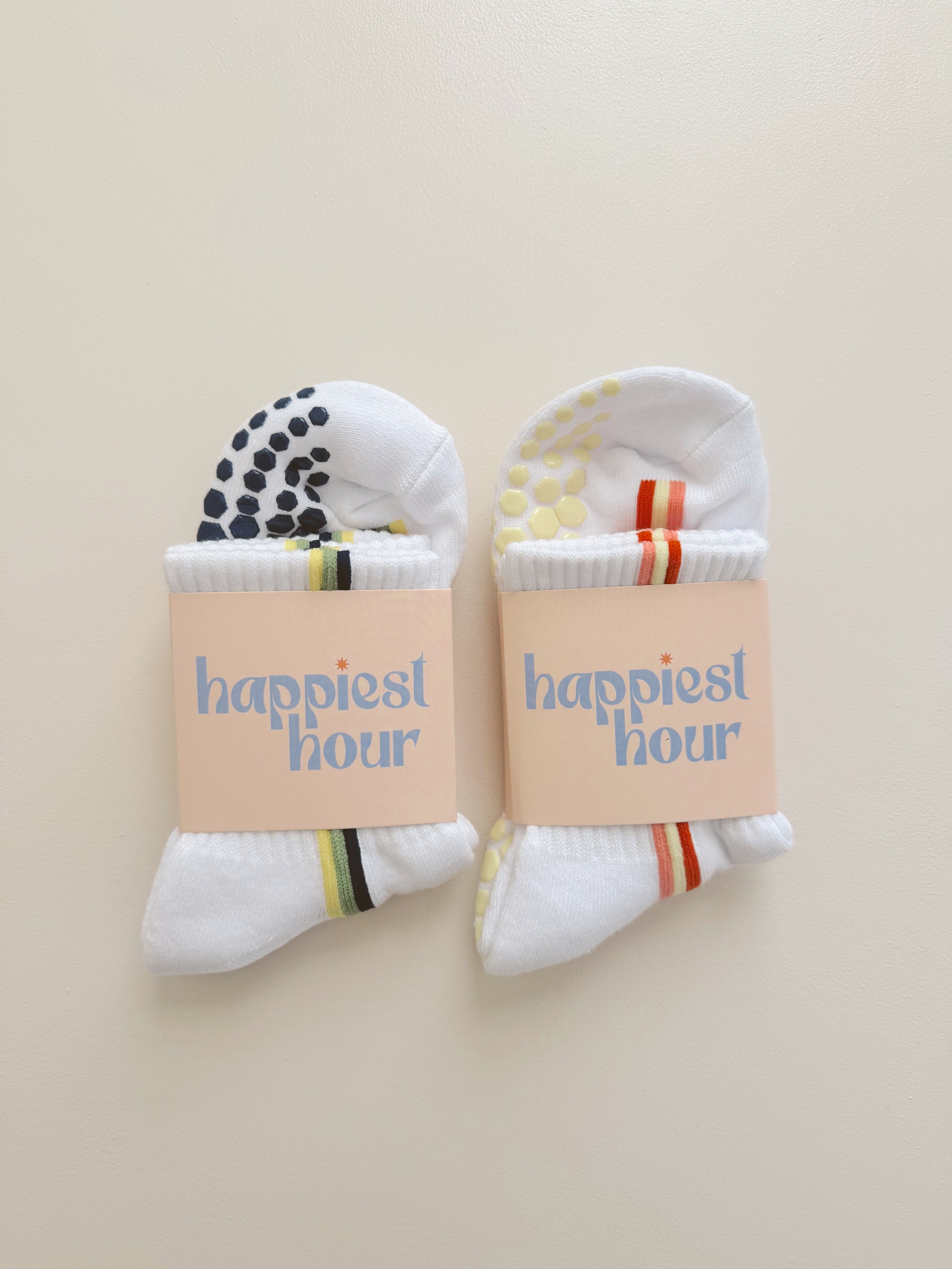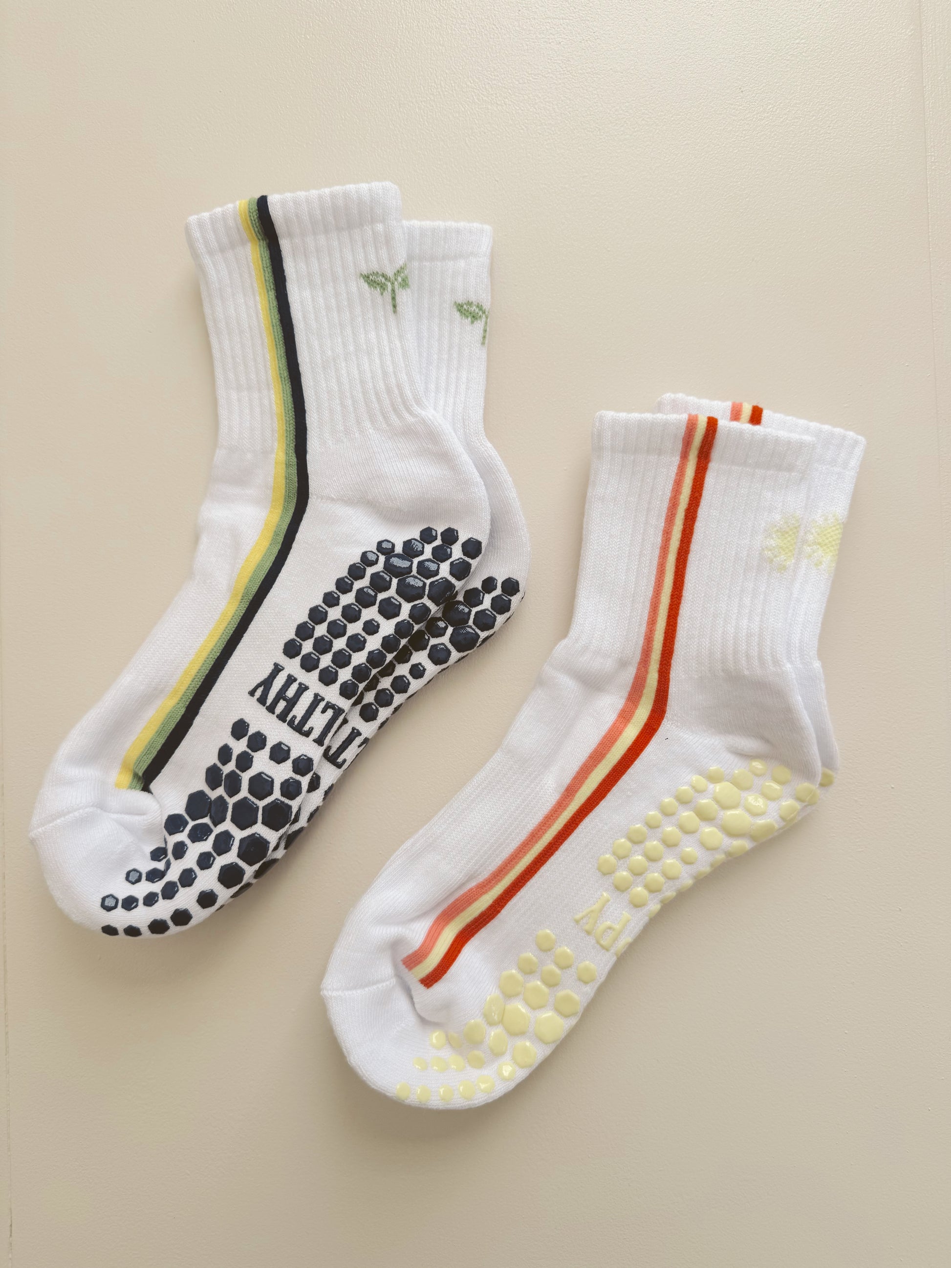 This set includes both pairs of socks from our collaboration with Casey Malone, @caseyshappyhealthy! Both pairs include colorful vertical stripes down the side, a sprout and sun emblem knit into the back of the socks, and a custom grips just for this collection that says "Healthy" and "Happy" on the bottom!